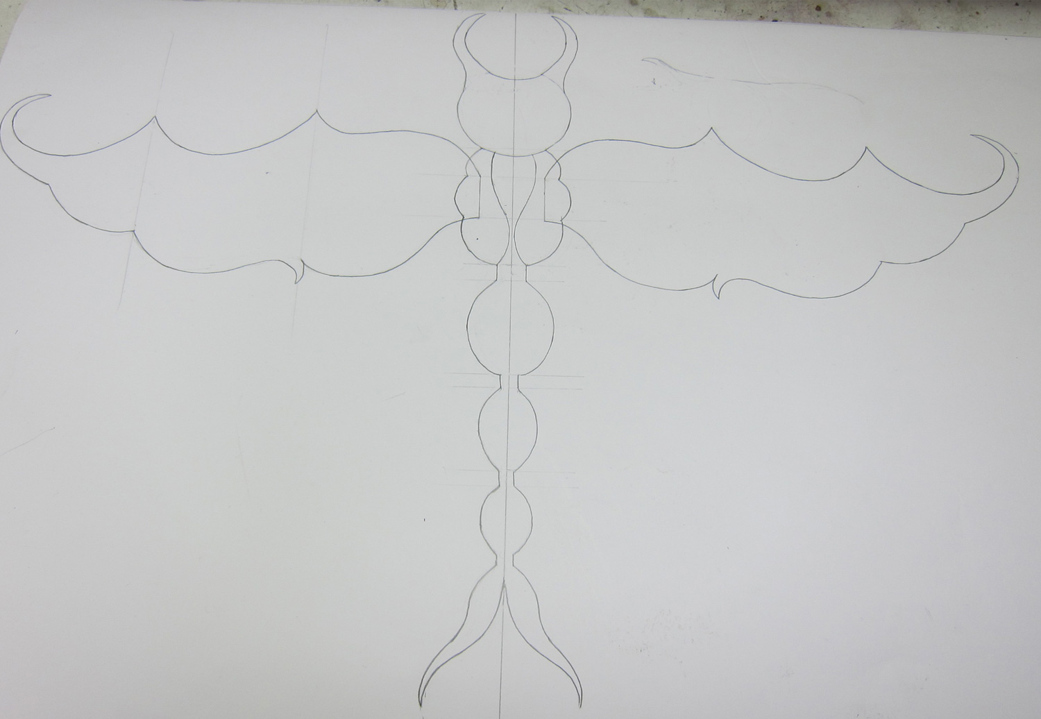 I got the shape from an egg that I drew segments on. I made smaller ones just by drawing out smaller segments. The Dragonfly Fighter is getting direction.