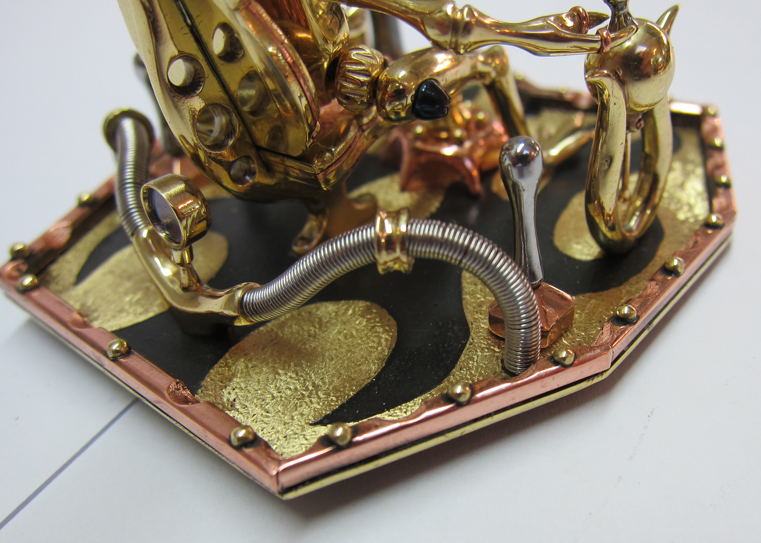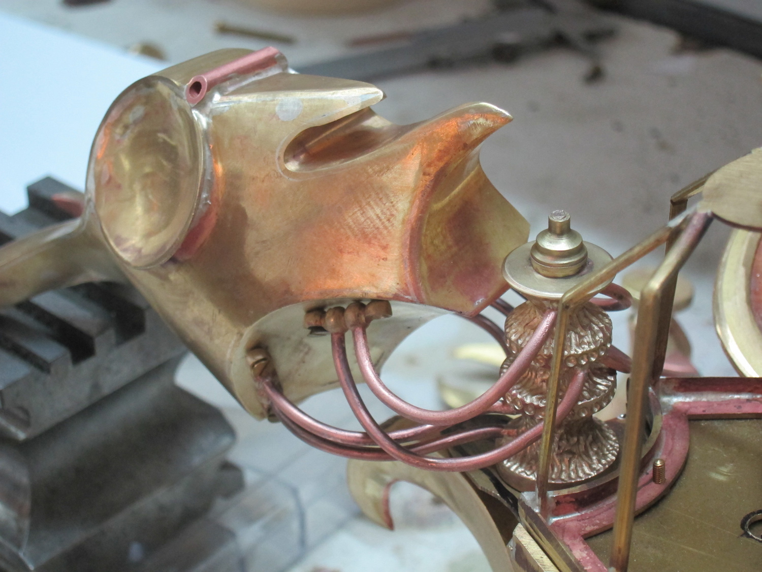 The head swivel system. I wanted it to be a sort of hydraulic affair with a sort of brain/guide to interface with the pilot. I soldered the fluid control pipes to the central pilot interface. It is a central nervous system, which is the link between the body and the head, carrying out the commands of the pilot.
