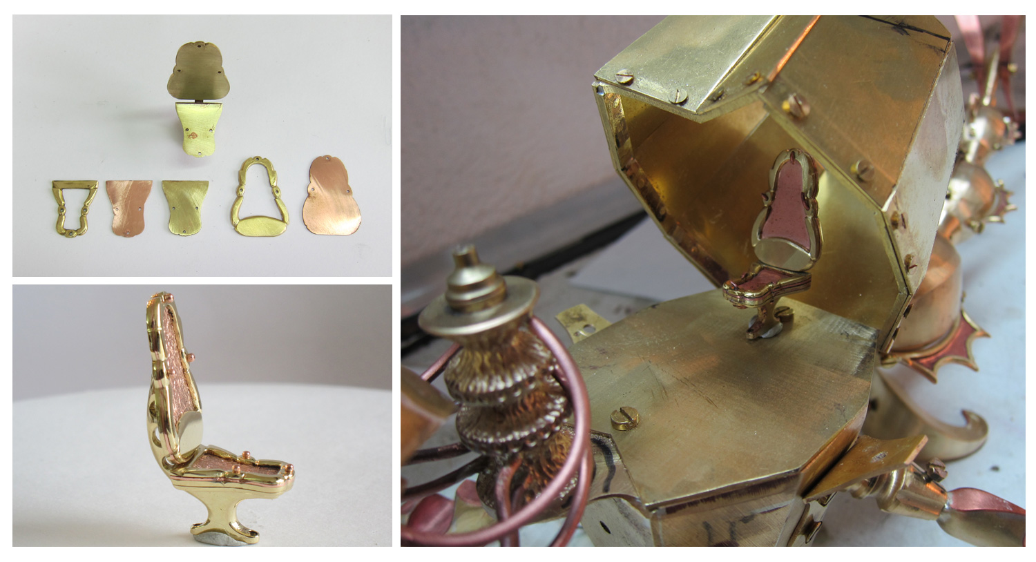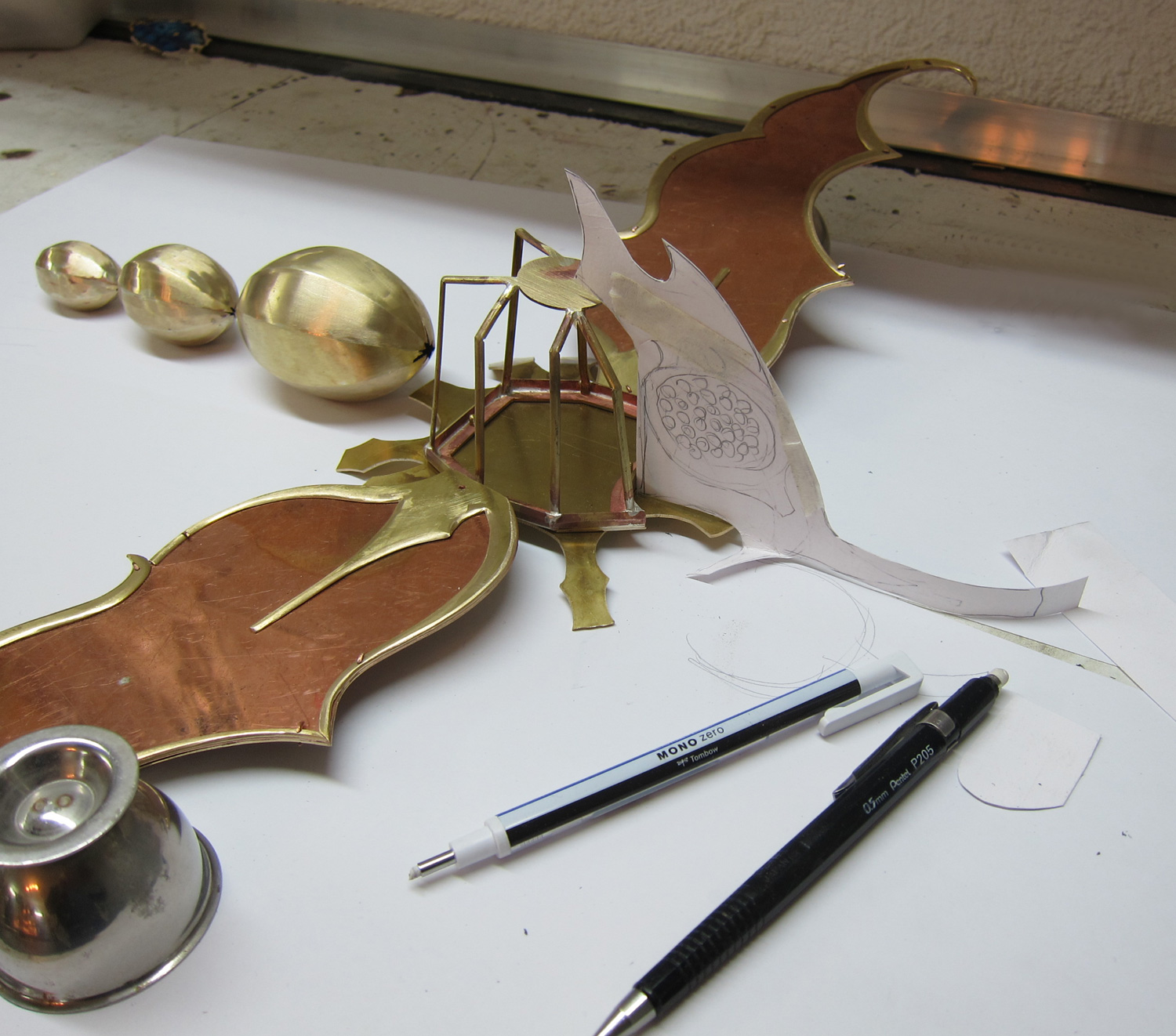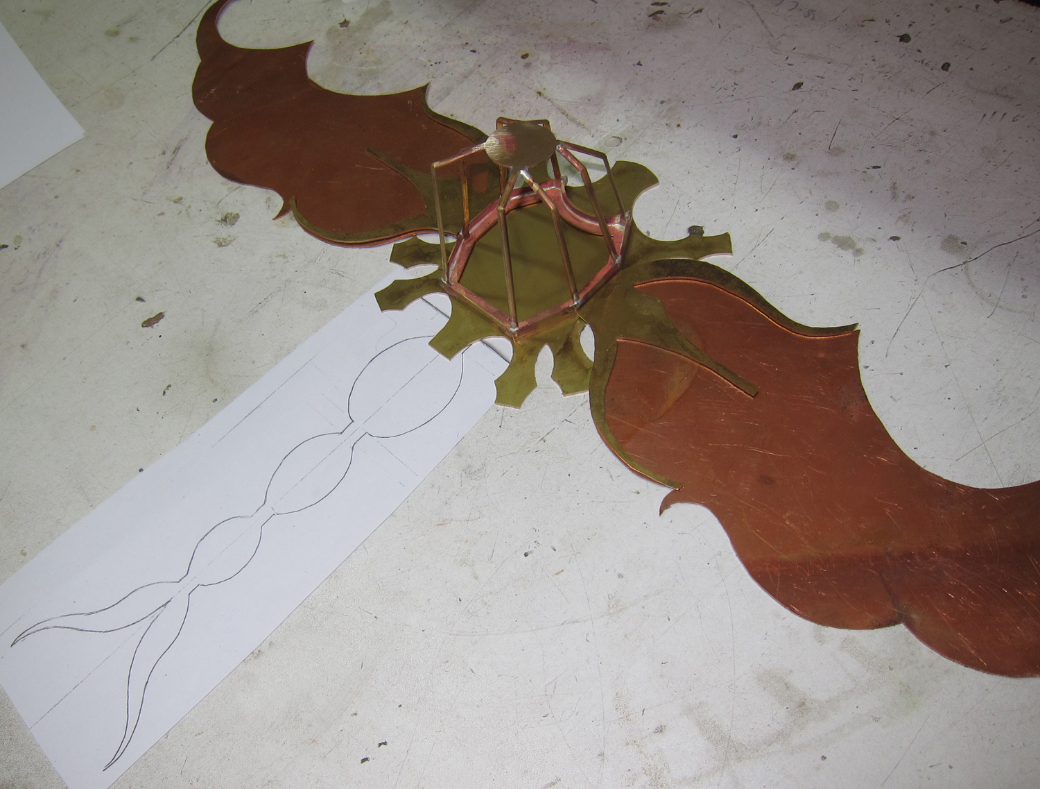 First thing I figured, was to make a platform for the cockpit and the brass plate that the wings were going to be attached to. I decided to go for the flat military look. Then I move on to the basic wings, cut out of 0.7mm copper. I lie them like that to see if I am happy with the proportion, because I basically have no reference to compare to.