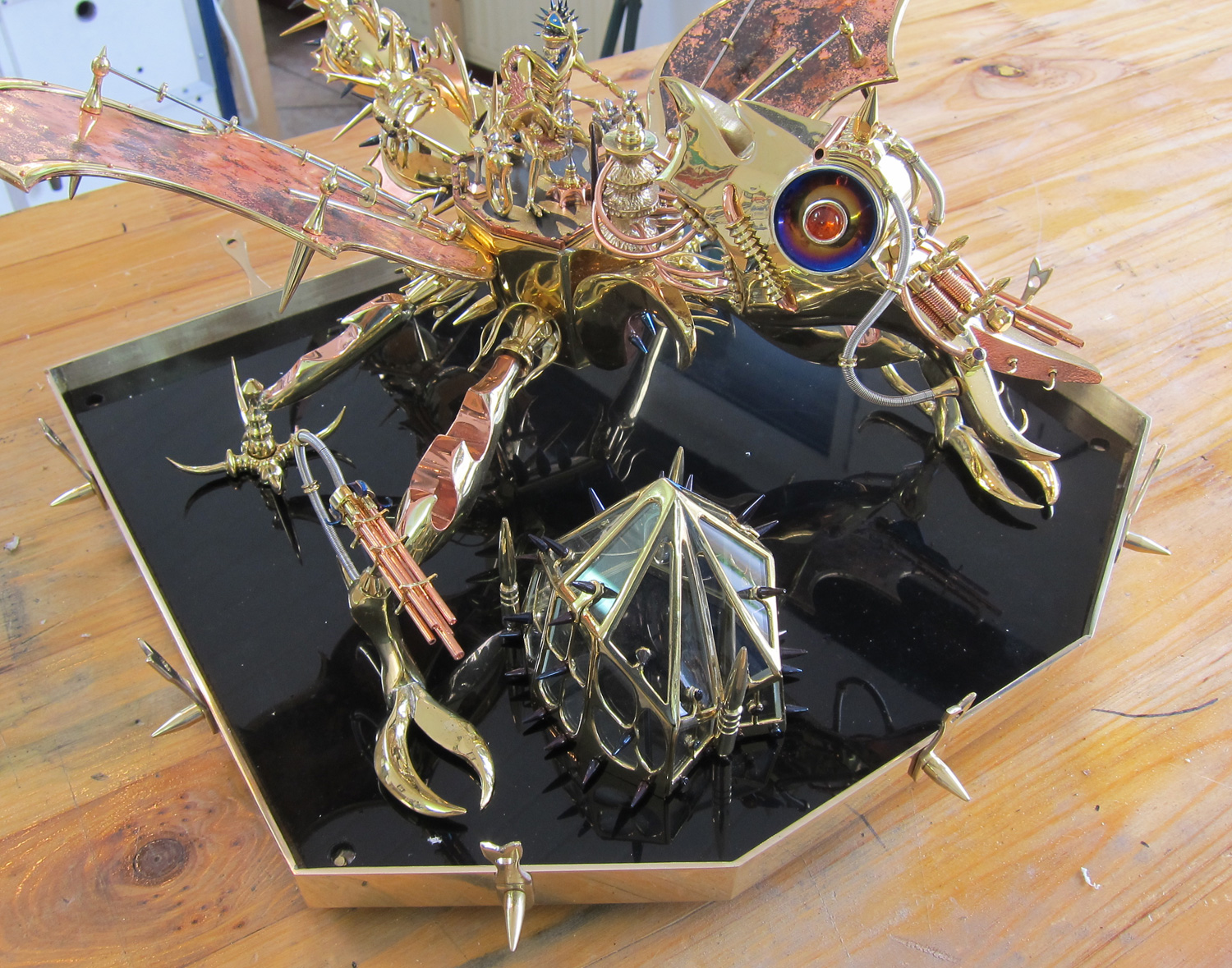 I wanted the cockpit to be removable so that the inside could be easily seen when the Dragon Fighter is on display. With many back and forth designs and after all was said and done, here is a picture of all the components prior to final assembly. All the spikes are threaded with a 2 mm thread and they screw into the cockpit frame through the hole drilled through the glass.