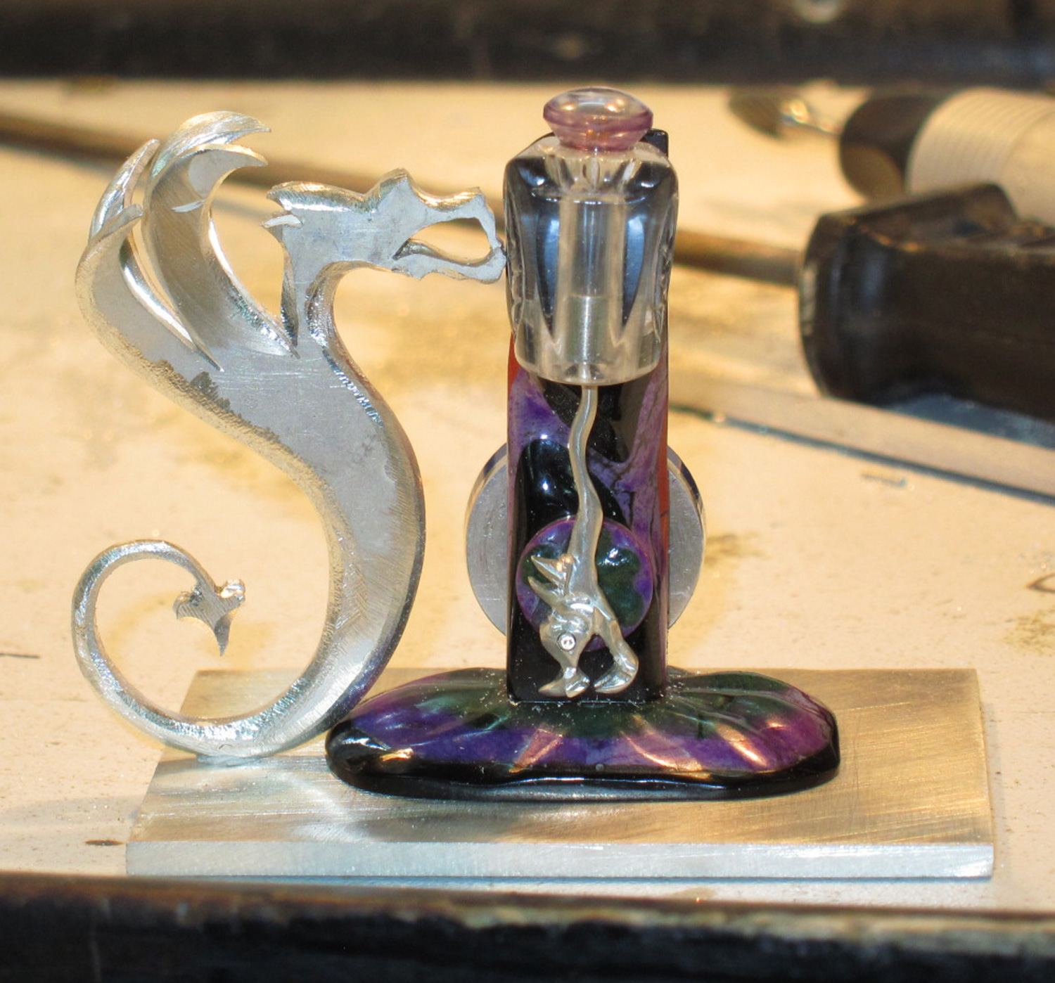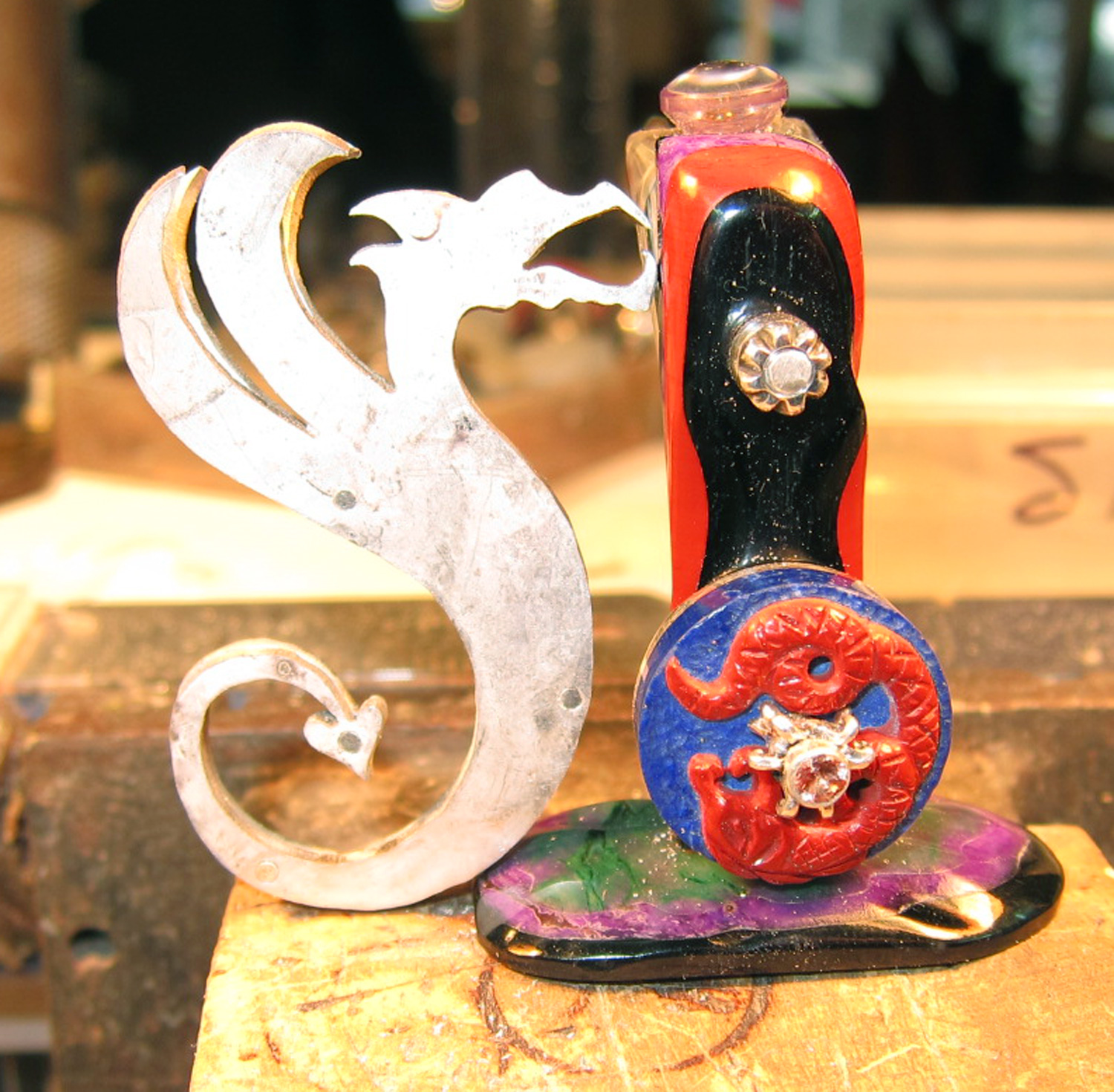 The start. Laminated slices of black Jasper, Sugilite and red Jasper, carved into a dragon embryo, which is then laminated with silver to form the flywheel of the steam engine. The base is made out of Onyx, Sugilite and Chrysoprase.
