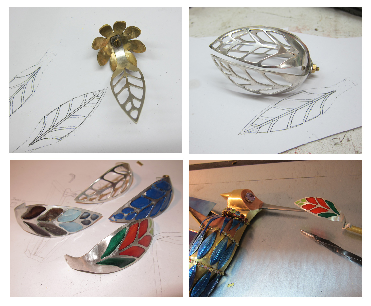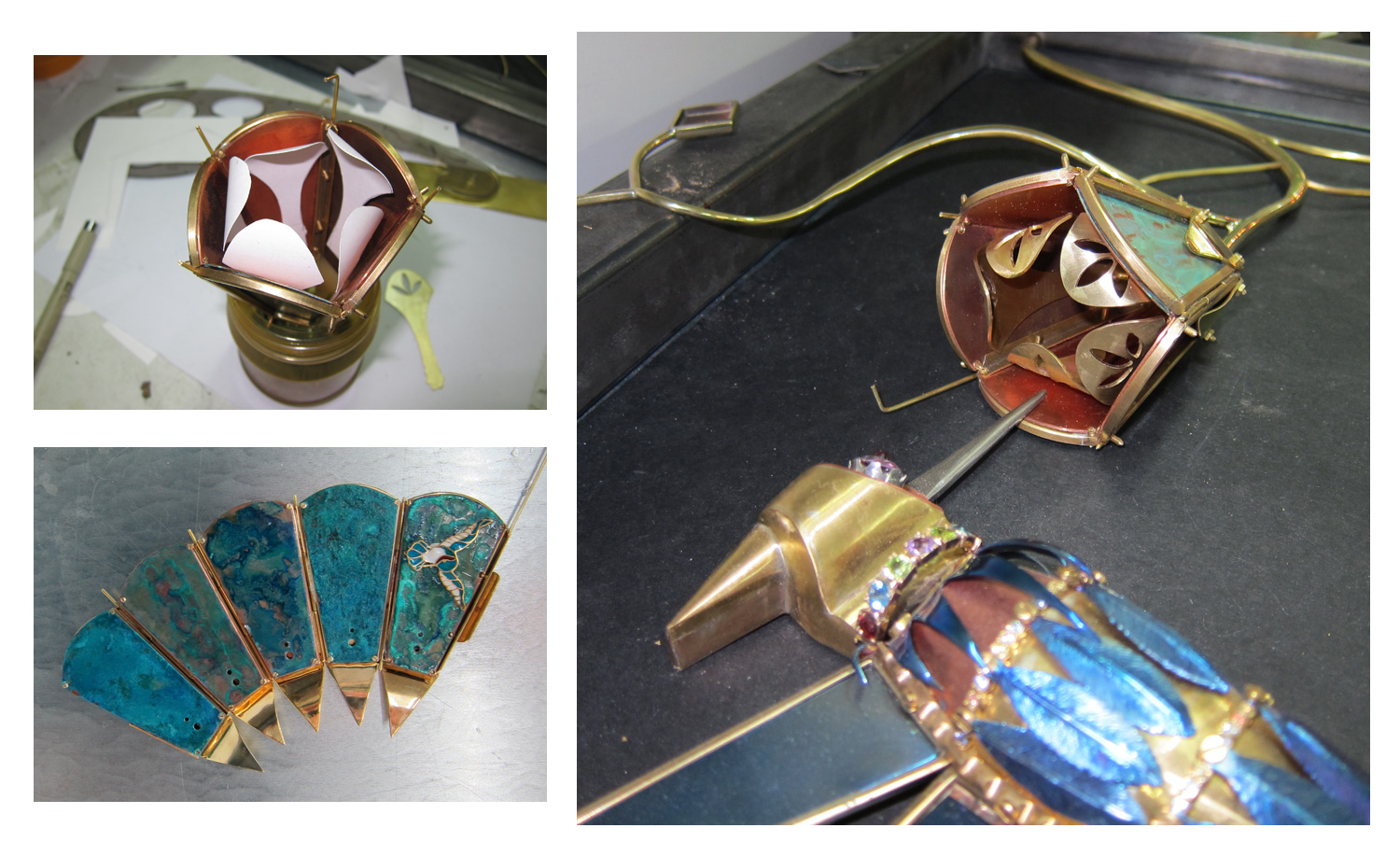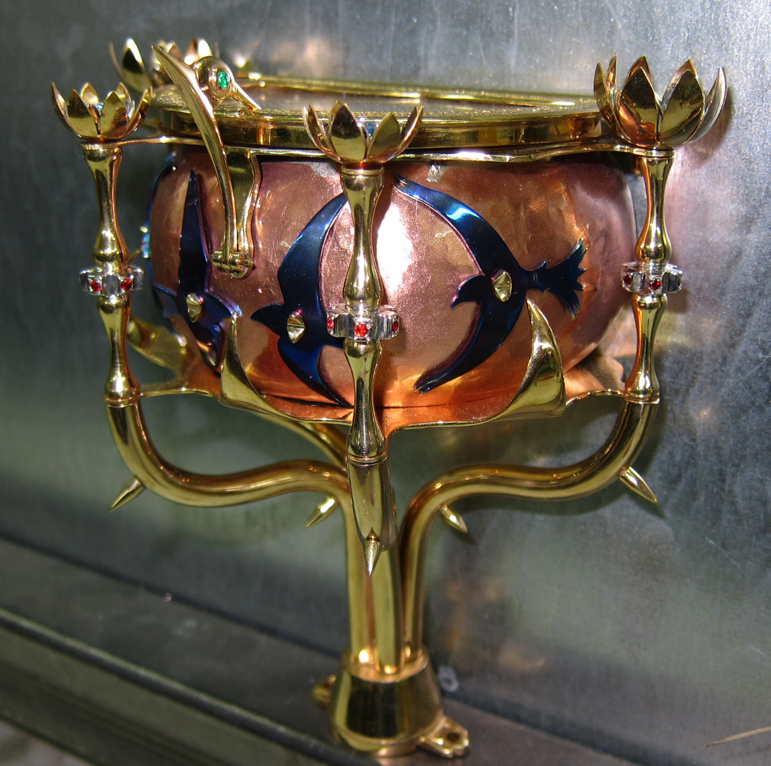 My plan was to make a stylized flower that would open for the hummingbird and then contain a precious piece of jewelry that the owner of this art work would own.