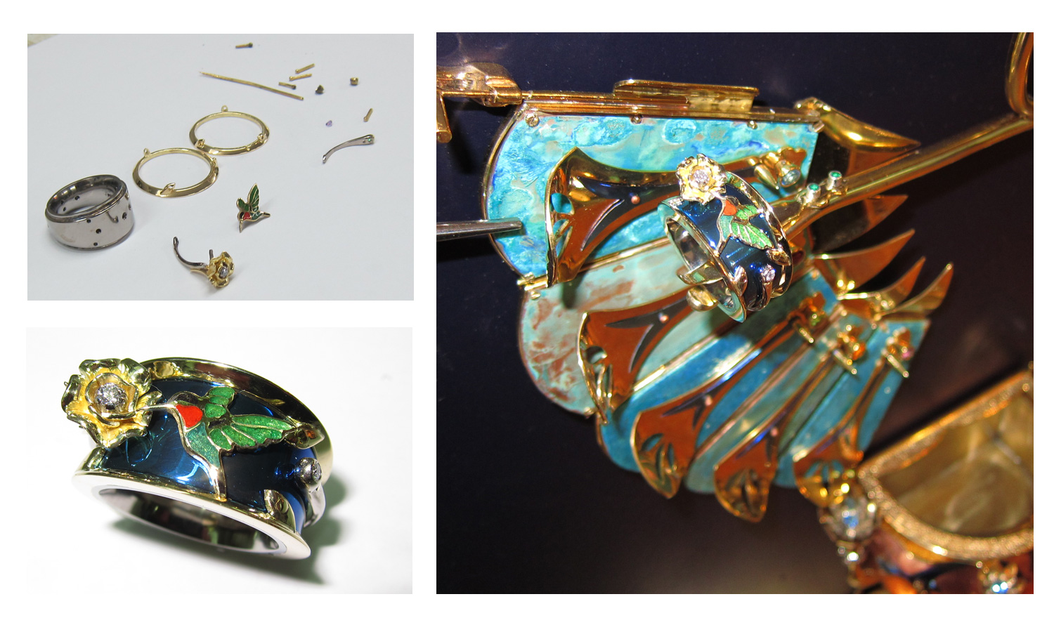This is an interactive wall sculpture with a hidden treasure, for which I designed a gold and titanium ring with a flower and enameled hummingbird.