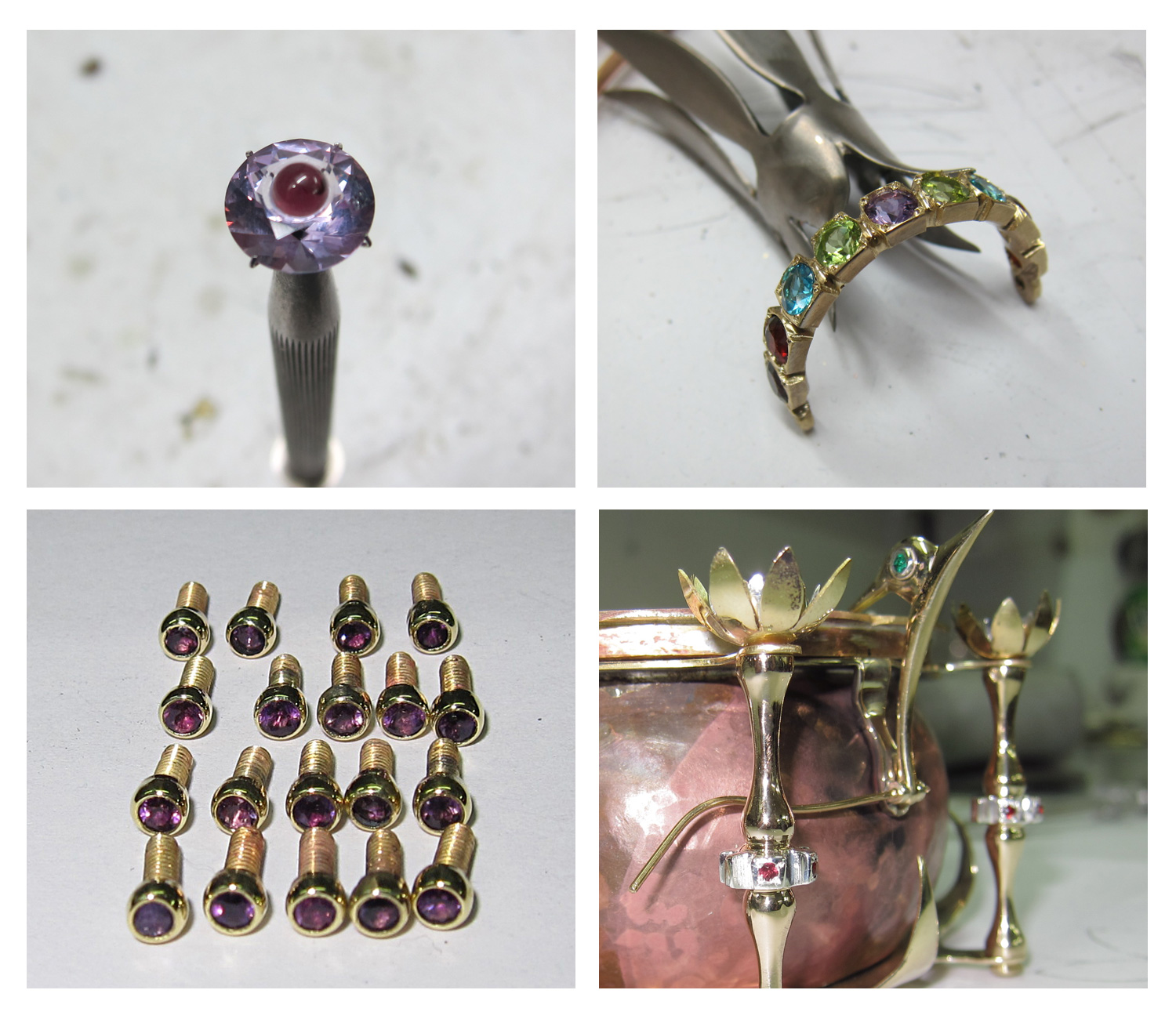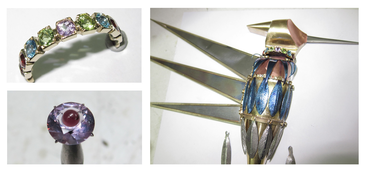 For the collar, I made a strip of square collets and set some 5 mm gemstones in it. I also made colorful gemstone bands to join the blued titanium feathers. For the eye, I cut a 15 mm amethyst. After it was faceted, I drilled a hole into it. I cut and set a 3 mm cabochon garnet into the center. The beak is made of titanium.