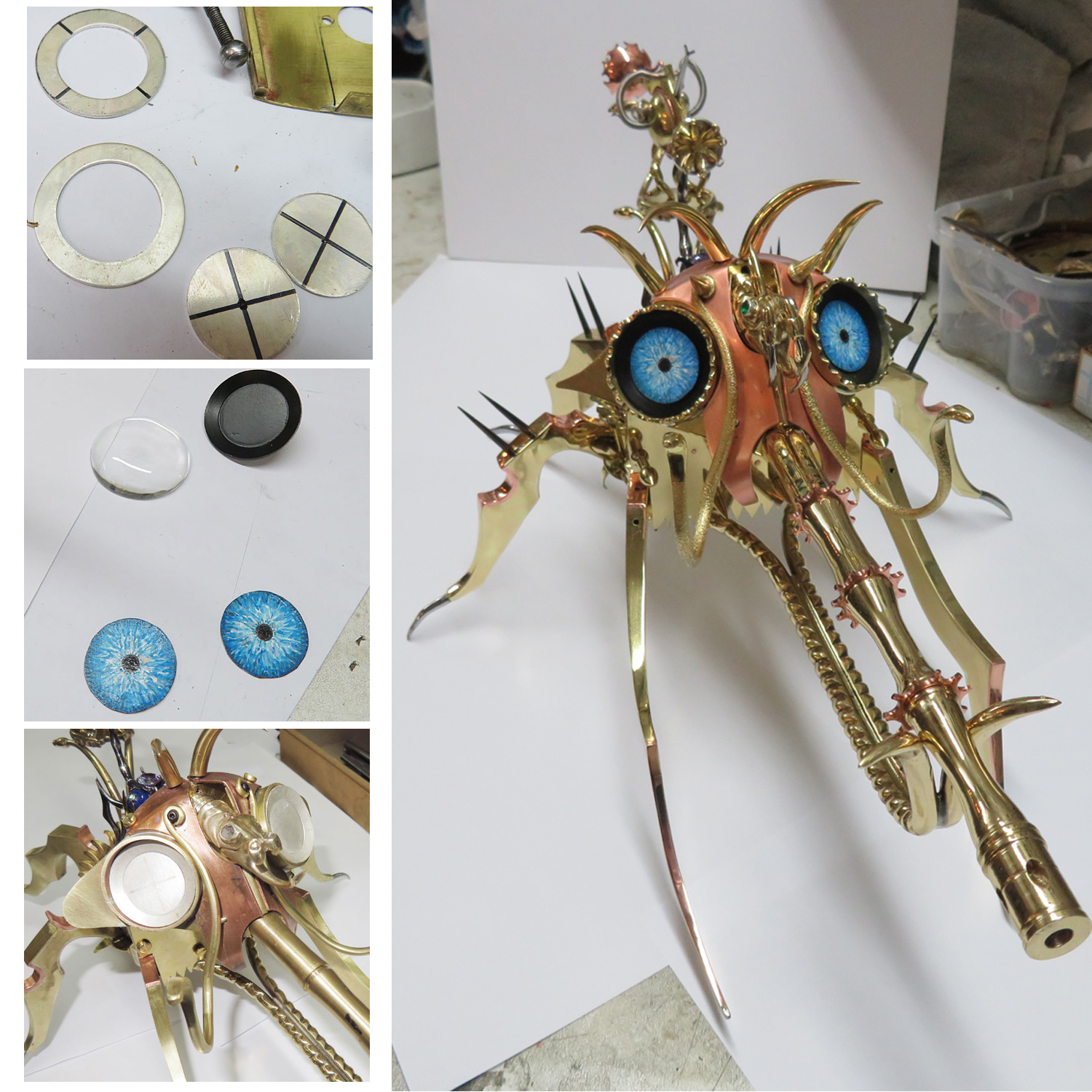 Now, now I do battle the eyes. I added bigger 30 mm diameter circles made out of silver, that will contain the eyes. I think they look better, more bug like. I like the piercing look of those blue eyes.