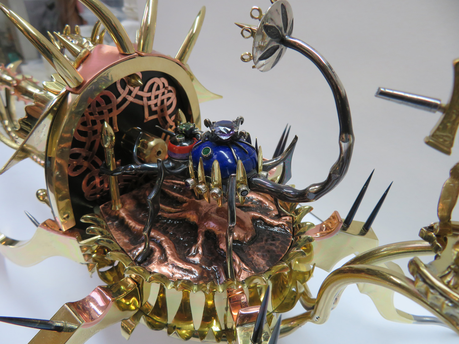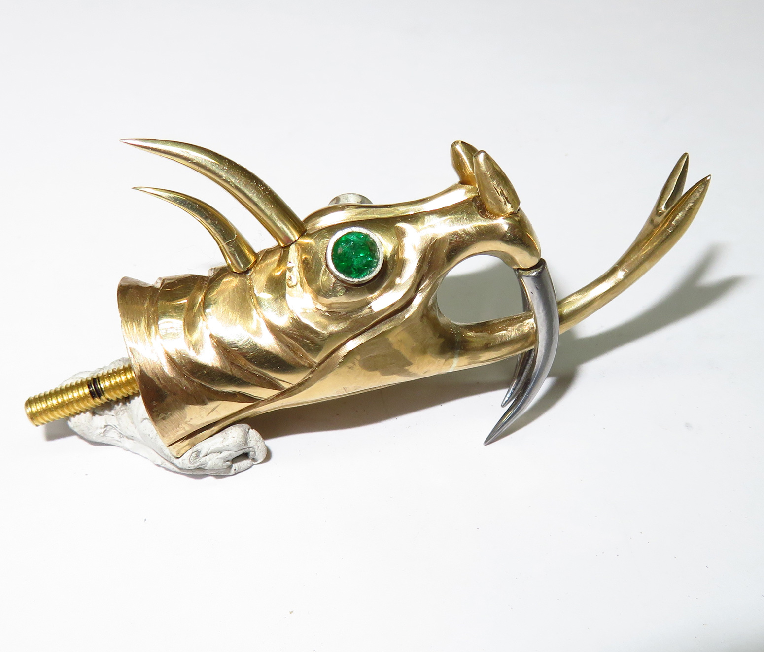 To complete it, I added horns, steel teeth and eyes set with Sandawana emeralds.