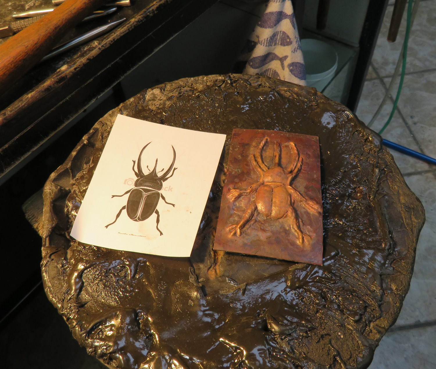 I decided to do some repoussé on copper of a beetle on the platform.