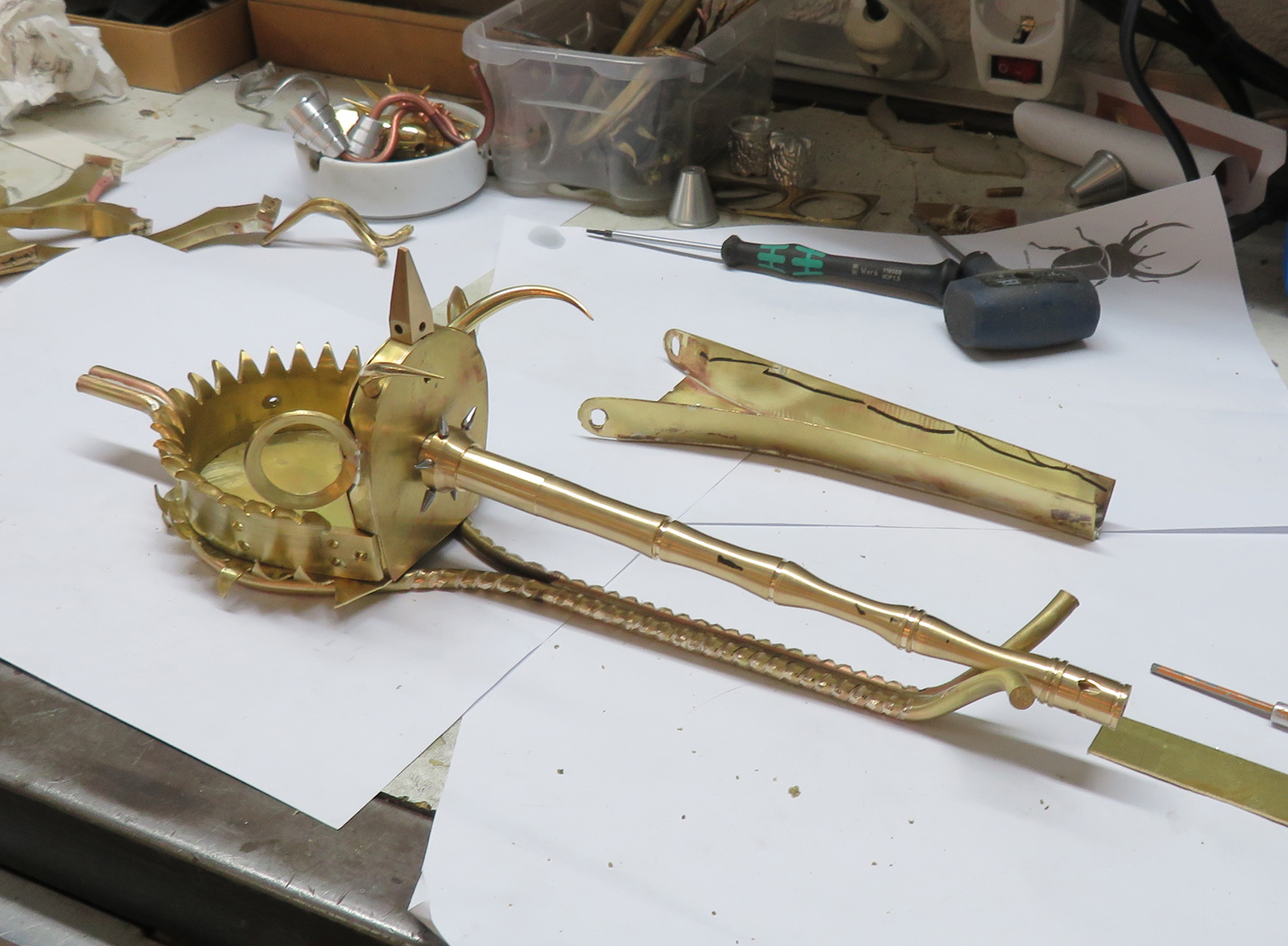 Then I attached the legs and added a 1 mm base onto the body. The brass plate is covered with paper at the moment.